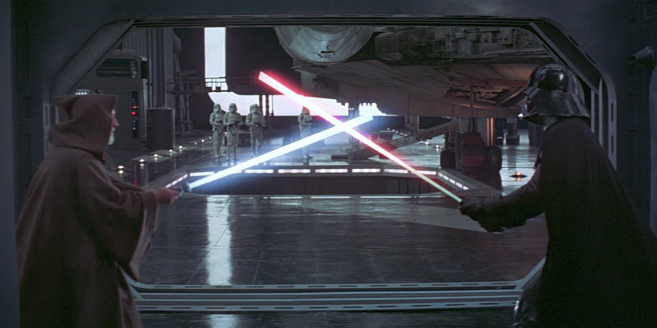 Obi-wan manages to turn off the beam and sneak all through the Death Star all while not being seen by any of the Stormtroopers. Darth Vader senses his old master’s presence and is immediately drawn to him. Vader lays in wait at the hall that connects to the Falcon. His Lightsaber is drawn.